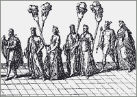 In Rom feierten die Sklaven mit ihrem Herrn, man saß myrtenbekränzt bei Tische, trank und aß nach Herzenslust, konnte jedes freie Wort wagen und überschüttete sich mit kleinen Rosen. Aus den Rosen wurde in unseren Tagen das Konfetti. Die Römer veranstalteten farbenprächtige Umzüge, bei denen ein geschmückter Schiffswagen, der “carrus navalis”, mitgeführt wurde. Daraus bildete sich die Bezeichnung Karneval und nicht aus dem italienischen “carne vale”, “Fleisch lebe wohl”, wie so oft behauptet wird. Die Römer kannten nämlich den Aschermittwoch, auf den das “carne vale” zutreffen würde, gar nicht. Der Aschermittwoch mit seinen Bußübungen kam erst im christlichen Mittelalter auf. Und was machten die Gallier? |